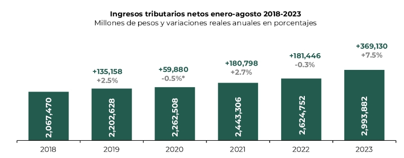 El SAT, que opera bajo la Secretaría de Hacienda y Crédito Público (SHCP), destacó que durante todo el sexenio se ha observado un crecimiento constante en los ingresos fiscales. Si se compara la recaudación hasta agosto de 2023 con la del mismo período en 2018, se ha registrado un aumento de 926,000 millones de pesos en términos nominales, lo que representa un incremento del 45% y un crecimiento real del 12.5%.
